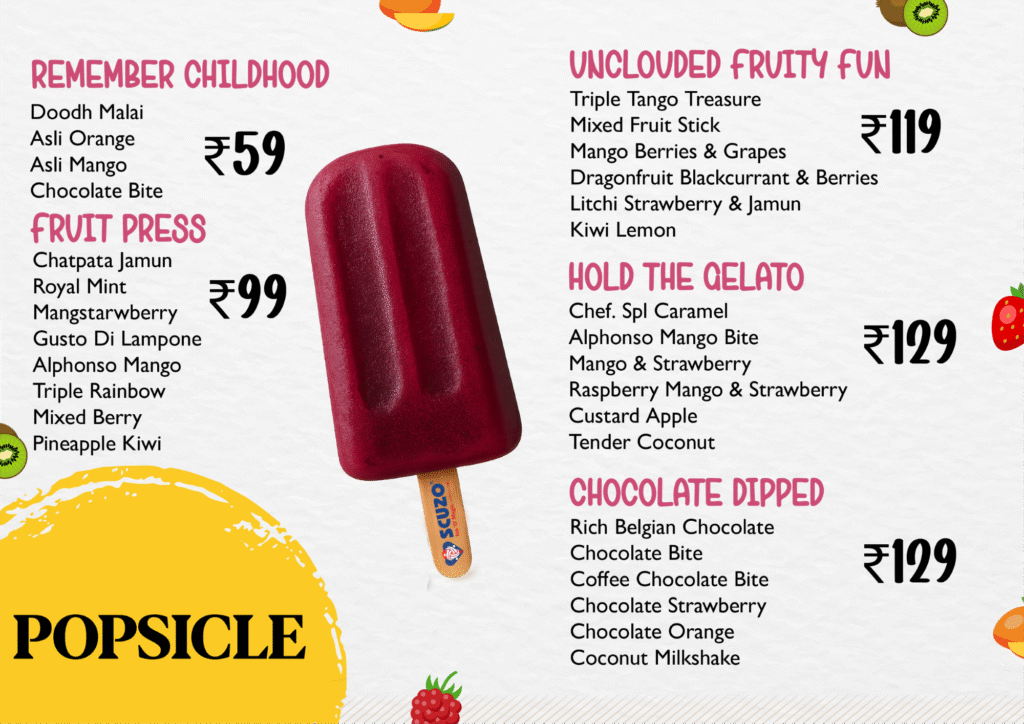 At Scuzo, we don’t discriminate among our consumers, catering to every age group. While our initial focus was on health-conscious individuals with selective taste buds, our unique concept and creative flavours have resonated with a wide audience. We’re particularly proud to be a favourite among kids and their parents to choose a right product by transforming real fruits into delightful popsicles and gelato, we’ve found a way to introduce healthy and nutritious treats that kids love and parent’s trust.